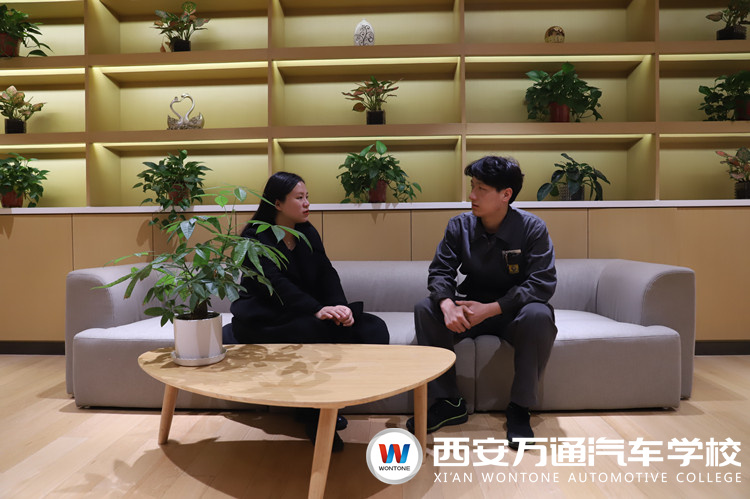 學子劉鵬,今年21歲,2020年從萬通畢業后就職于陜西龍泰廣興領克中心,目前月薪7000+,擔任售后服務顧問一職。在訪談中他講到,見到母校老師他十分激動,沒想畢業后學校老師還會來到他的就業企業一對一回訪指導。工作以后他有了新的感悟和思考,趁此機會和彭主管進行了深入的交流。彭主管也在訪談中勉勵他們要勤奮工作、拼搏進取,為企業做貢獻,為西安萬通爭光,多回母??纯?。