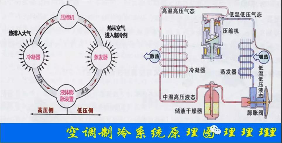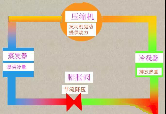 高壓液體經過節流(膨脹閥)降壓降溫流入蒸發器,并在相應的壓力下蒸發,吸取周圍熱量,同時車內側風扇使車內空氣不斷進入蒸發器的翅片間進行熱交換,并將放熱后變冷的氣體送向車內。如此室內外空氣不斷循環流動,達到降低溫度的目的。