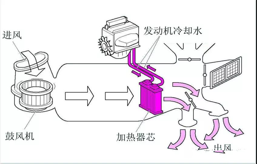 工作原理:在汽車空調的制熱系統中,熱量并非是由空調系統產生的,而是由發動機冷卻液產生的。