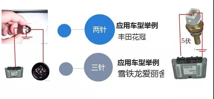 它分為兩線式和三(四)線式。兩線式水溫傳感器它把數據傳遞給電腦,電腦分析數據的大小,水溫過低、過高都會讓報警燈點亮,綠低紅高;三(四)線式水溫傳感器其中兩根線,是把數據傳給電腦的,另外兩根線把水溫數據傳給水溫表,實時線式當前的水溫。三線式共用搭鐵線、四線式搭鐵線也是分開的。