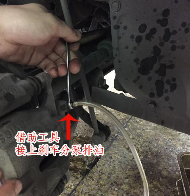 第六步 去車內開始踩剎車。如果是兩人操作的話,可一人去踩剎車,一人觀察放油。注意橡膠管內剎車油的顏色,舊油顏色較深,新油顏色較淺,如發現橡膠管內排出的已是較淺的新油則此輪的換油已完成。停止踩剎車,然后接下來三個輪胎反復此操作。