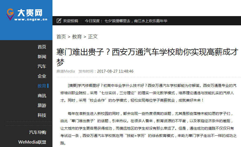 【大貴網】寒門難出貴子?西安萬通汽車學校助你實現高薪成才夢