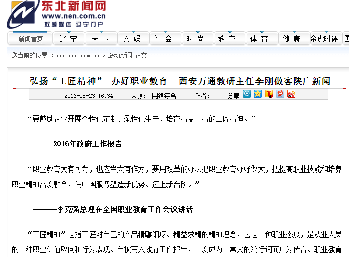 近日,西安萬通汽修學校教研中心主任李剛應陜廣新聞邀請,就“工匠精神”與職業教育之間的關系向廣大廣眾談了談自己的思考與看法。李主任指出,中國的職業院校是“中國工匠”的搖籃,只有辦好職業教育,不斷專注提升職業教育的質量、信心以及素養,中國工匠才會既“專”又“精”。而與此同時,在“工匠精神”的引領下,職業教育大膽探索,勇于嘗試,協調發展,才會以精致的辦學方式培養專業技術人才。正如西安萬通汽修學校成立28年以來一直專注汽車教育,也在不斷的弘揚“工匠精神”,所以才能夠取得今天這樣振奮人心的成就。