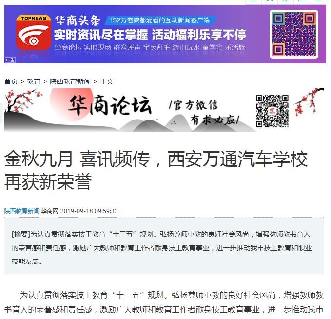 【華商網】金秋九月 喜訊頻傳,西安萬通汽車學校再獲新榮譽