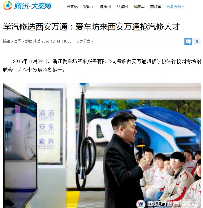 2016年11月29日,浙江愛車坊汽車服務有限公司親臨西安萬通汽修學校舉行校園專場招聘會,為企業發展招賢納士。
