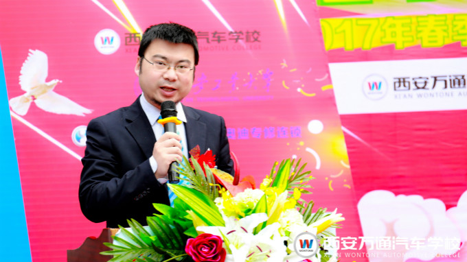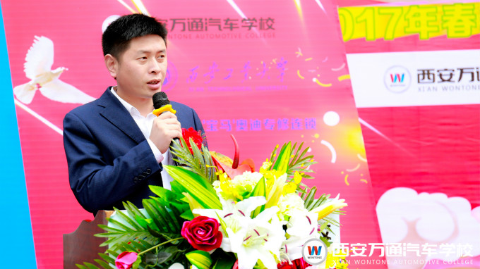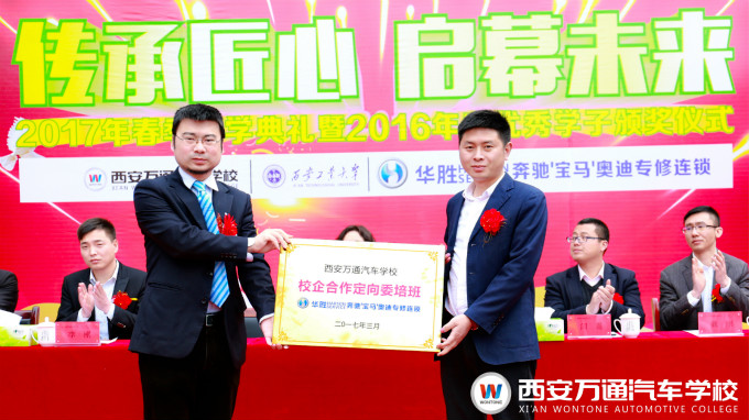 此時,典禮到了揭牌階段,由西安萬通汽車學校與華勝奔寶奧專修攜手開設的“校企合作定向委培班”今日揭牌,預示著有一個名企定向委培班在西安萬通誕生。李偉總監作為企方代表發表講話,指出西安萬通與華勝之間聯系的淵源,并且雙方以“校企合作”為契機共同致力于汽修人才的培育與發展。