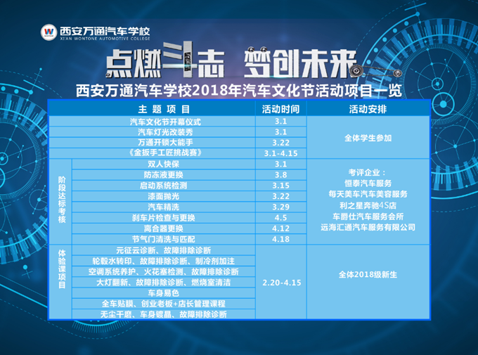 大地回春,盎然生機,西安萬通汽車學校也是一片欣欣向榮,一年一度的汽車文化節又如期而至。2018年3月1日,西安萬通隆重舉行了汽車文化節開幕式,作為年度盛事,本屆文化節以“點燃斗志 夢創未來”為主題,為學子生們提供了充分展示青春活力的舞臺。