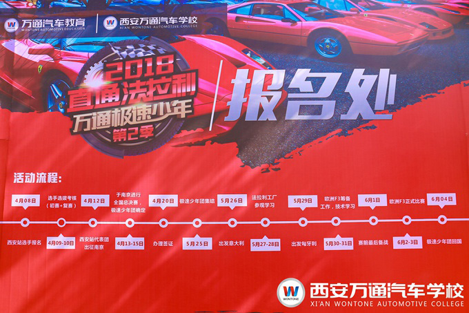 根據萬通極速少年(第2季)活動安排,2018直通法拉利項目活動招募報名之后,便是各個招募站點技能選拔的初賽、決賽,西安站定于3月9日——3月10日開展技能選拔。究竟誰能突破重圍,問鼎南京決賽,敬請關注!
