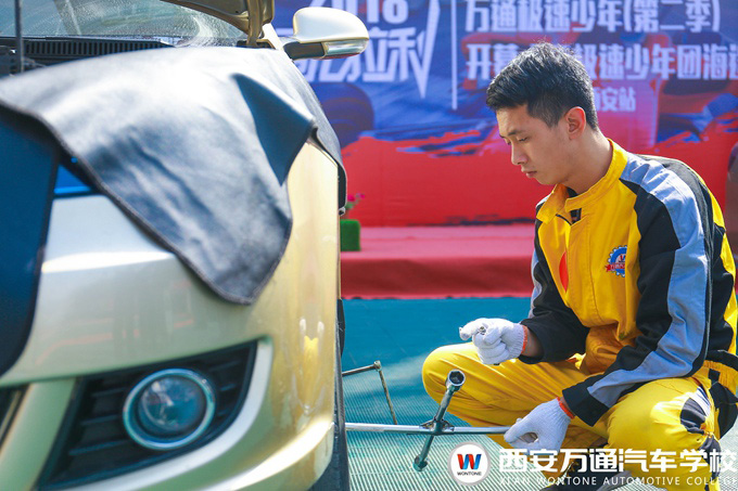 這里還有一位值得關注的學子,他就是西安萬通汽車檢測與維修專業裴紀凱,他個性活躍,但面對技能操作也流露出應有的細心與耐心,在比賽期間面對獨自一個要完成整輛車的四輪換位與更換剎車片等項目,他表現的百折不撓,堅韌不拔,面對困哪,決不退縮,在他意識中:別人可以做到的,自己一定要做的更優秀,若能成功入選2018直通法拉利萬通極速少年團,那將是給自己的最大鼓勵。