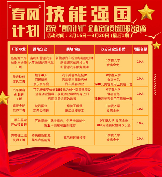 西安萬通汽車學校開設的“春風計劃”是在上級部門的大力支持下、眾多企業全力參與中的大力助學優惠政策,進一步發揮了我校技能培訓的特長及企業定向委培的優勢,通過企校合作、工學交替方式,可培養一大批企業新型技工人才,帶動待業青年就業穩定!