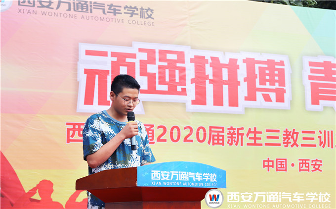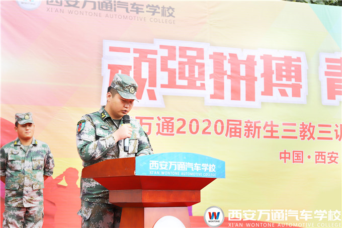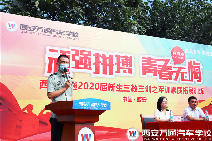 西安萬通校長助理爨助做軍訓動員,他指出軍訓作為萬通汽車教育“三教三訓”的重要組成之一,期望學生們珍惜軍訓生活,以飽滿的熱情、旺盛的斗志、頑強的毅力、威武的軍姿、恢宏的氣勢來展示我校學子的勃勃生機和奮發向上的精神面貌。