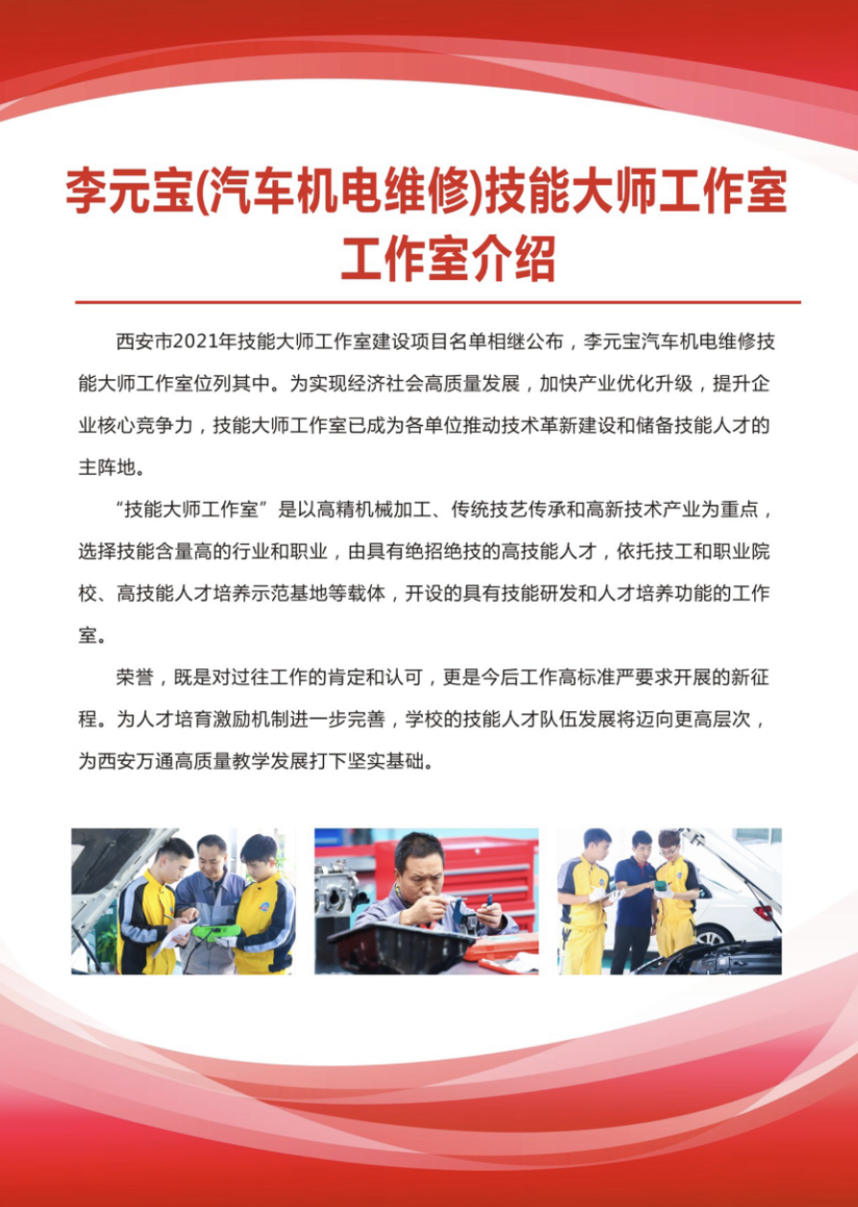 近日,西安市人力資源社會保障廳公布2021年市級技能大師工作室名單,我校金牌講師李元寶汽車機電維修工作室被評為西安市技能大師工作室!