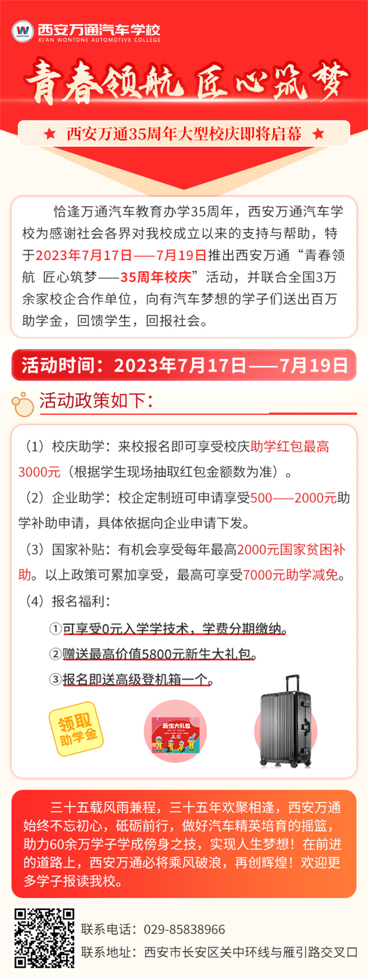 恰逢萬通汽車教育辦學35周年,西安萬通汽車學校為感謝社會各界對我校成立以來的支持與幫助,特于2023年7月17日——7月19日推出西安萬通“青春領航 匠心筑夢——35周年校慶”活動,并聯合全國3萬余家校企合作單位,向有汽車夢想的學子們送出百萬助學金,回饋學生,回報社會。