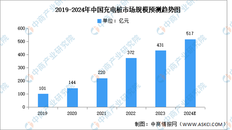 ①市場規模 充電樁是新能源汽車基礎設施建設的重要組成部分,一個完整的充電樁主要包括充電系統、監控系統、計量計費系統等。在政策和市場雙重驅動下,充電樁產業迎來加速發展,市場規模實現快速增長。中商產業研究院發布的《2023-2028年中國充電樁專題研究及發展前景預測評估報告》顯示,按終端銷售口徑統計,2022年中國充電樁市場規模為372億元,同比增長69.1%,2023年約為431億元。中商產業研究院分析師預測,2024年市場規模將達517億元。