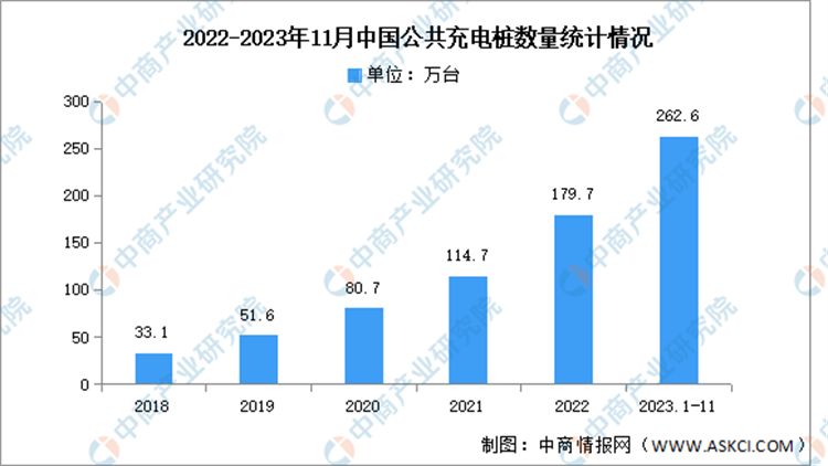 ②數量統計 中商產業研究院發布的《2023-2028年中國充電樁專題研究及發展前景預測評估報告》顯示,截至2023年11月,中國充電聯盟內成員單位總計上報公共充電樁262.6萬臺,其中直流充電樁114.08萬臺、交流充電樁147.7萬臺。從2022年12月到2023年11月,月均新增公共充電樁約7.5萬臺。