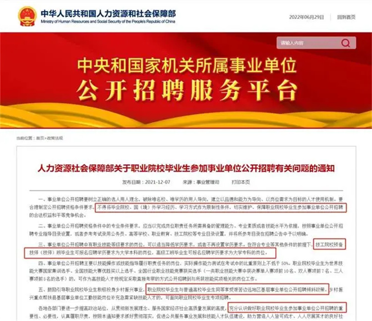 《通知》要求,事業單位公開招聘要樹立正確的選人用人理念,破除唯名校、唯學歷的用人導向,切實維護、保障職業院校(含技工院校)畢業生參加事業單位公開招聘的合法權益和平等競爭機會。