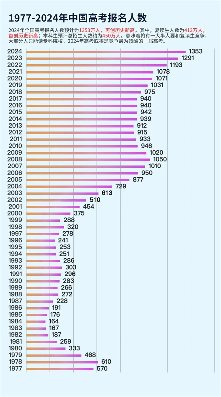 01歷年考生人數 據招生考試信息網2023年公布數據顯示,2024年預計達1353萬人,比2023年多出62萬人,再次創下歷史新高!其中,約有413萬人為復讀生,占高考人數的三分之一。 而2024年本科錄取名額預計為450萬,僅比復讀生人數多了37萬。這也意味著將有903萬的高考學子將從殘酷的競爭中落榜,無緣本科院校。