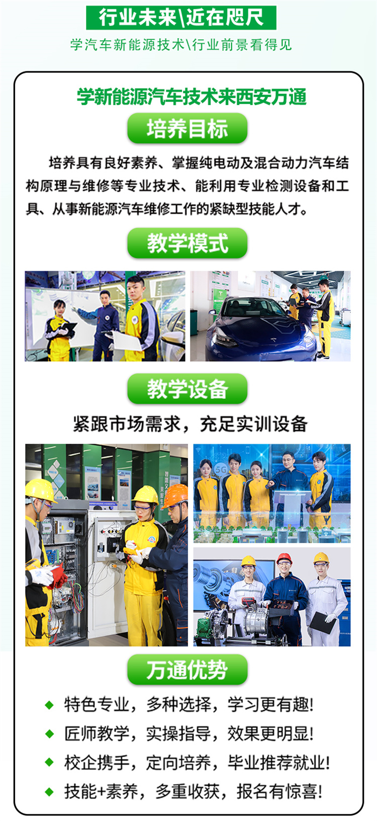 【把握現在,成就未來】 2024年國慶期間,是您選擇西安萬通、開啟新能源汽修之旅的黃金時刻。錯過本次機會,您將不得不等待至2025年春季入學,意味著晚畢業一年,錯失更多職業發展的先機。因此,我們誠摯邀請每一位懷揣夢想的學子,抓住這次難得的機遇,與西安萬通一起,在新能源汽修的廣闊天地中翱翔,共創輝煌未來!