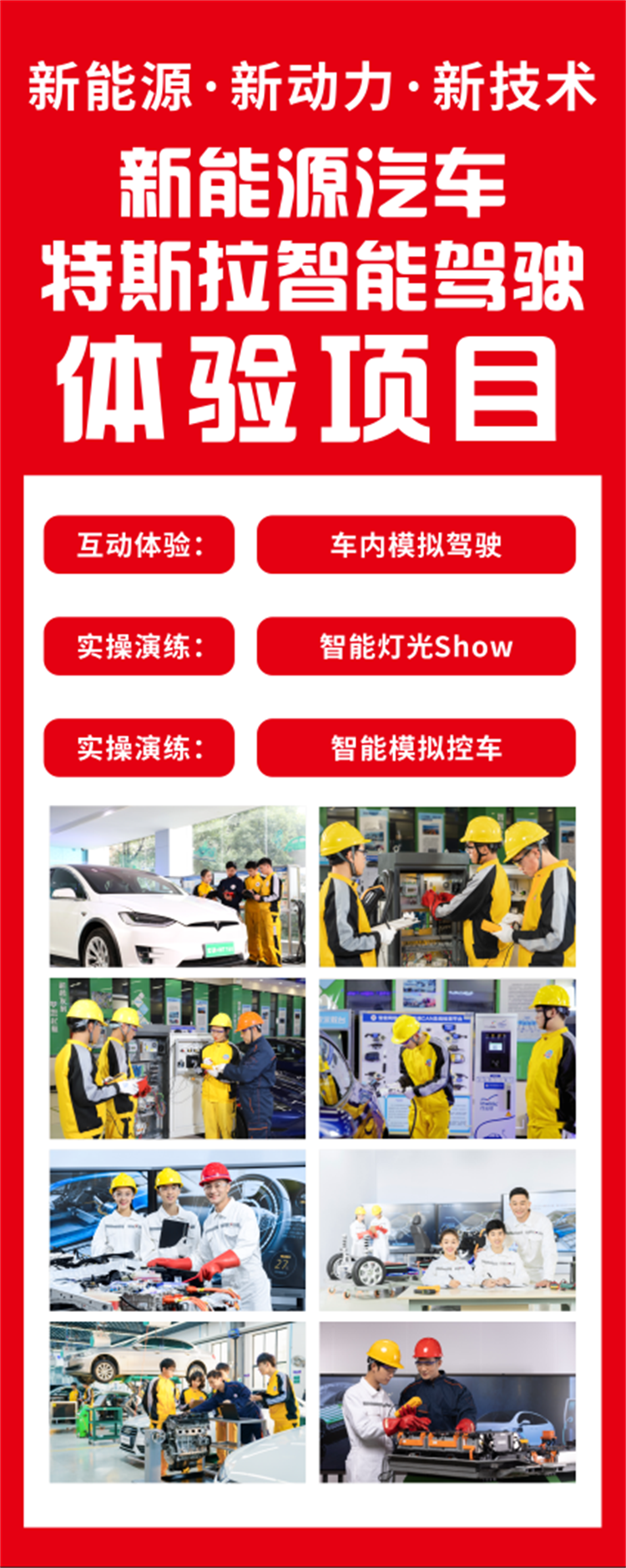 新能源汽車體驗項目 特斯拉智能駕駛 還沒開過特斯拉?來西安萬通!在課堂上,免費體驗特斯拉的多種智能駕駛樂趣。 你可以體驗到模擬駕駛、燈光show操作、智能汽車操控……只有感受到智能汽車的先進技術,你才會拓寬自己對汽車業的認知。