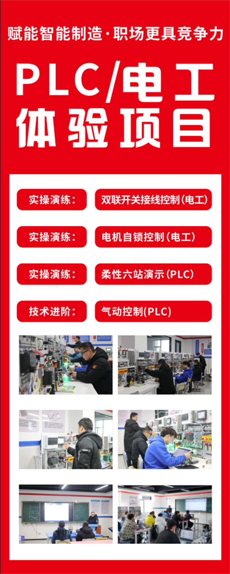 PLC/電工體驗項目 電工和PLC是相輔相成的兩個專業,零基礎學員可以在我校一次性學習電工和PLC專業,有基礎的電工可以直接學習PLC電氣自動化專業。 學習時間1——3個月,該專業全程實操,配備西門子系列設備,小班教學!老師具有多年豐富的工作和教學經驗,畢業后學校推薦就業!